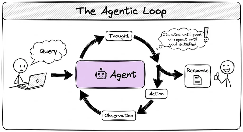Truy vấn → Suy nghĩ → Hành động → Quan sát → (lặp lại đến khi đạt mục tiêu) → Phản hồi
