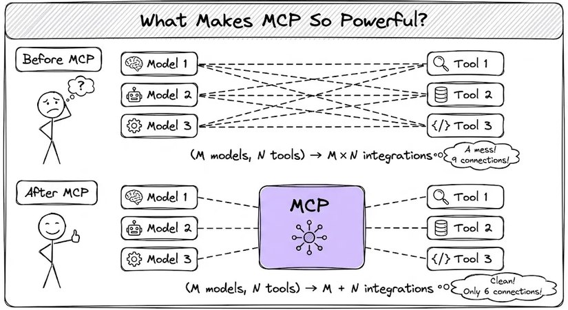MCPs (Model Context Protocol) đưa kiến trúc này lên tầm cao mới. Thay vì phải xây dựng N×M kết nối (3 mô hình × 4 công cụ = 12 điểm tích hợp), MCP giảm xuống chỉ còn N+M nhờ giao thức chuẩn.
